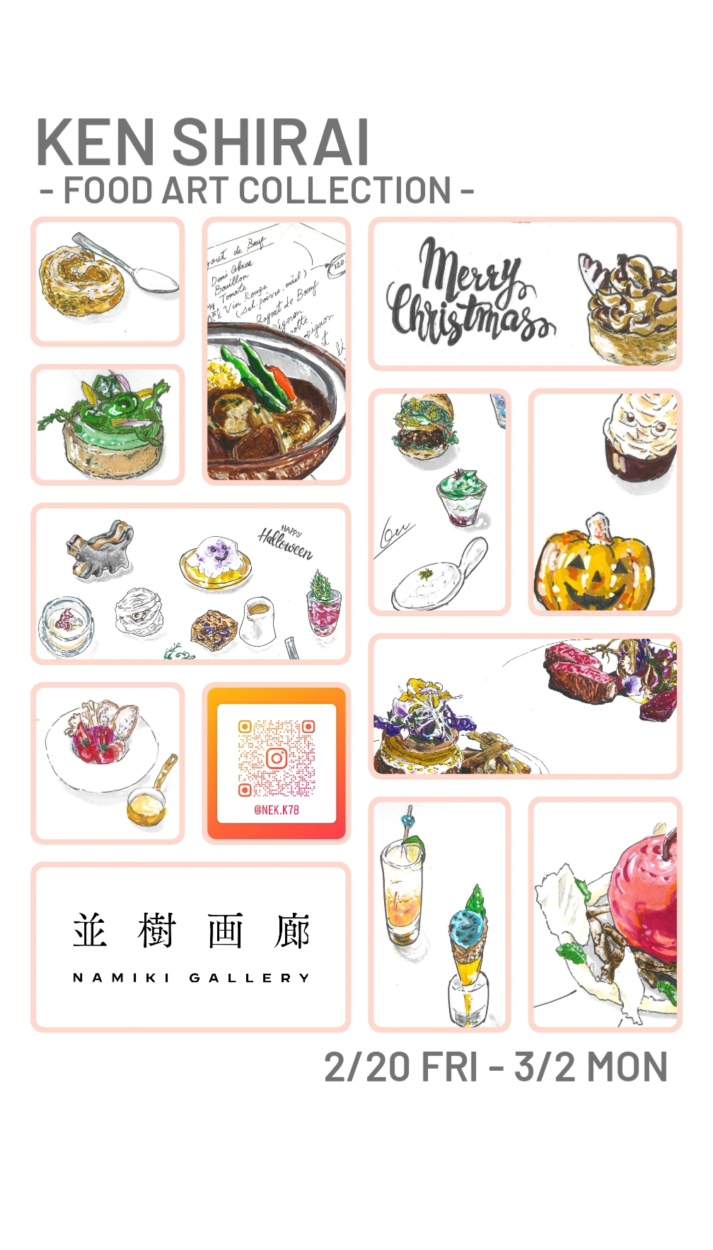 作品は絵画として楽しませるだけでなく、実際にメニューとなり、料理やスイーツへと姿を変え、お客様に感動と笑顔を届けてきました。繊細で美味しさまでもが伝わる表現力、そして白井シェフのあたたかな人柄が作品全体に息づき、心をやさしく満たしてくれます。