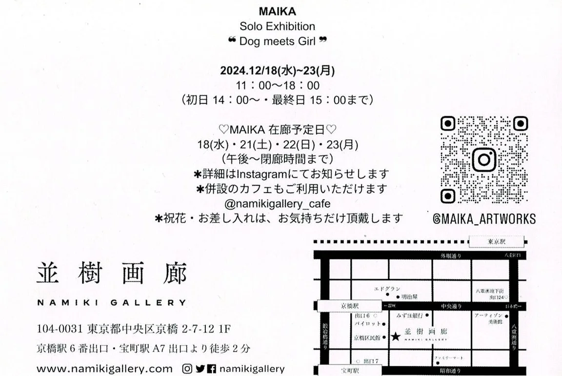 Maika Solo Exhibition "Dog meets Girl" Wednesday, December 18, 2024 2:00 PM 14:00 Monday, December 23, 2024 3:00 PM 15:00 並樹画廊 Namiki Gallery 2-7-12 Kyobashi Chuo City, Tōkyō-to, 104-0031 Japan (map) Google Calendar ICS MAIKA Solo Exhibition“Dog meets Girl” 2024年12月18日(水)~23日(月)11:00~18:00※初日は14:00開館、最終日は15:00閉館 作家instagram
